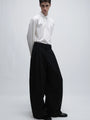 The fit features a large wide-leg design with a high waist, paired with a single pleat detail.